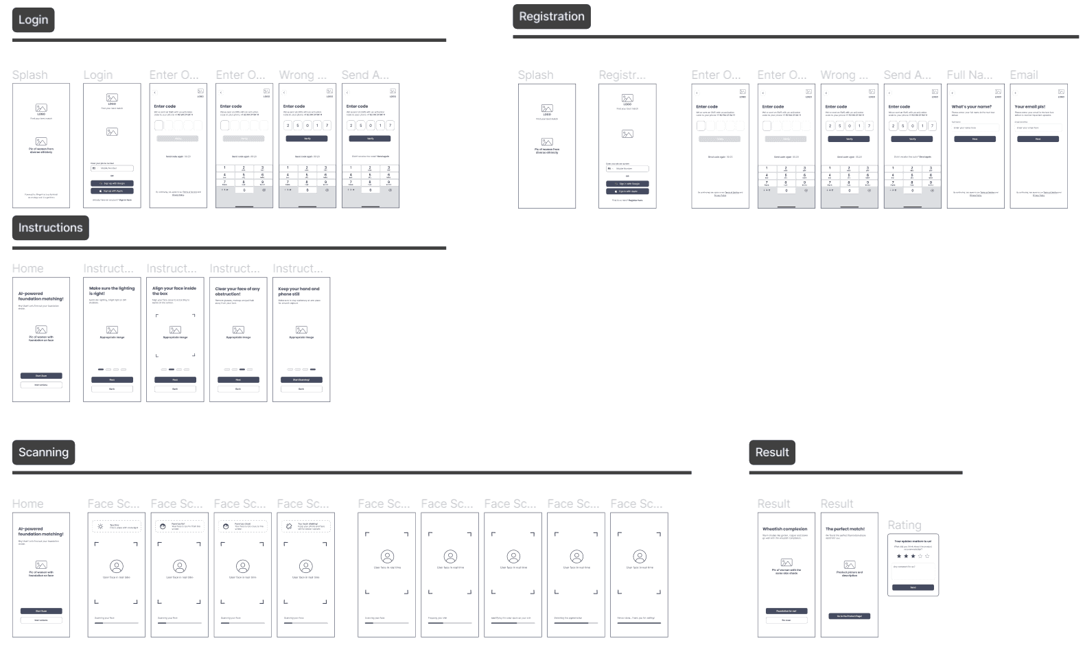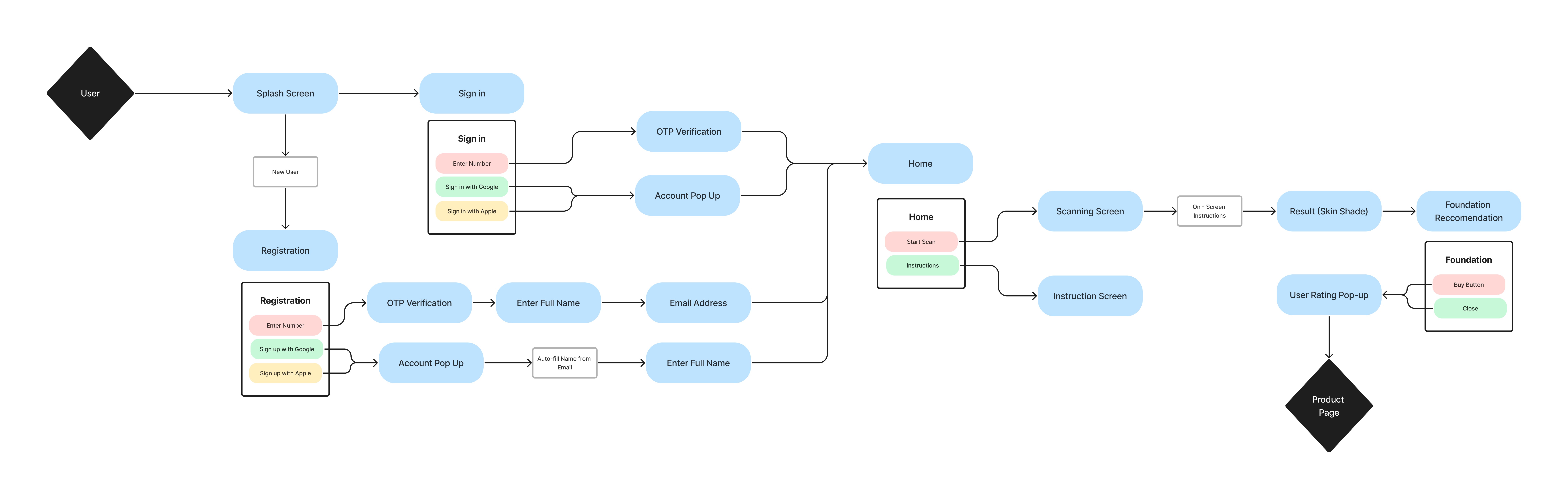 I mapped out the primary path user will take to complete the primary objective of obtaining the suggesting for the foundation product according to their skin shade.
