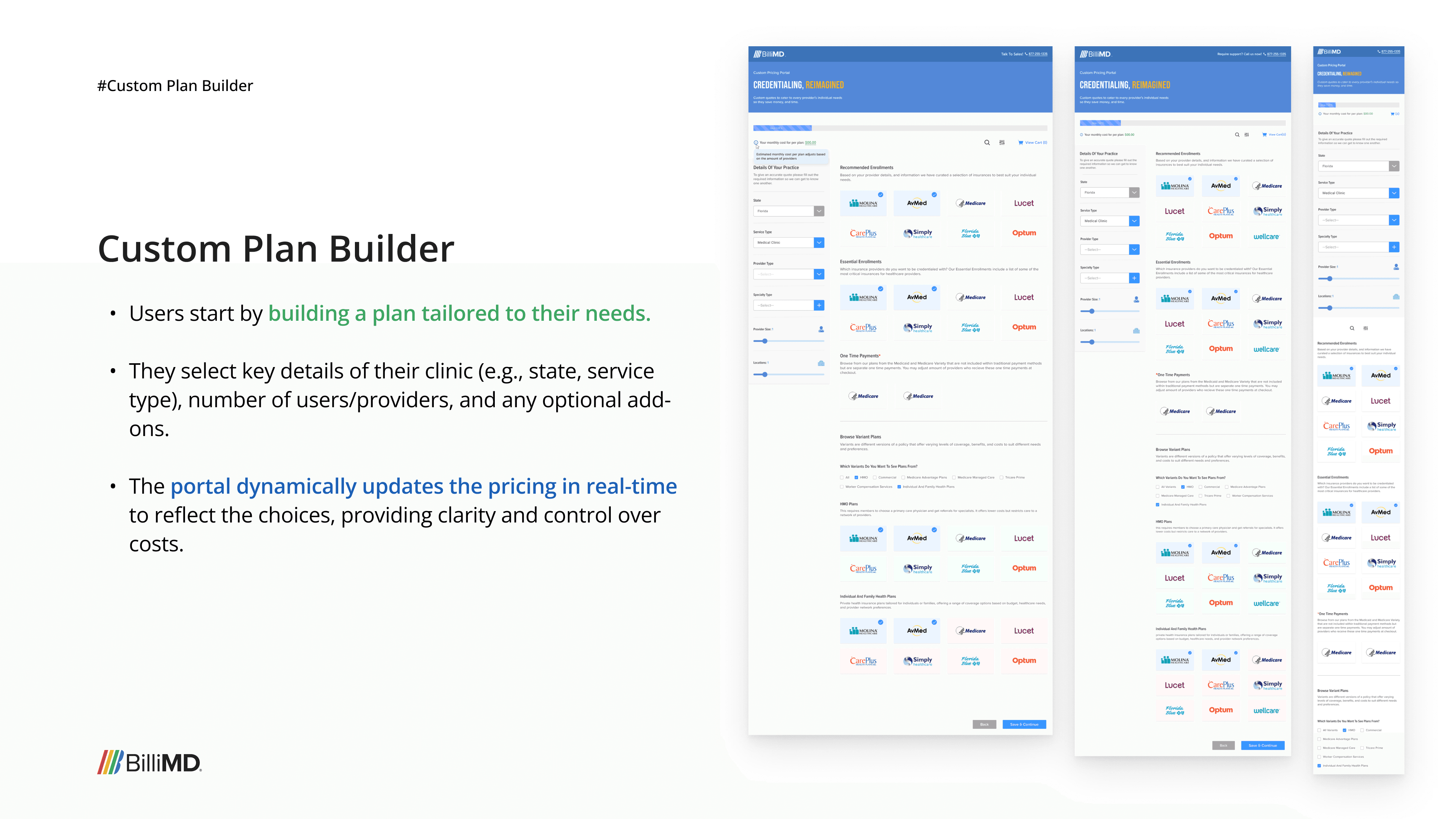 The first product we built wasn't the credentialing platform. It was a Custom Pricing Portal (CPP), a self-checkout tool that let healthcare providers independently browse insurance plans, configure their practice details, get a custom price quote, and check out all without talking to a sales rep.
