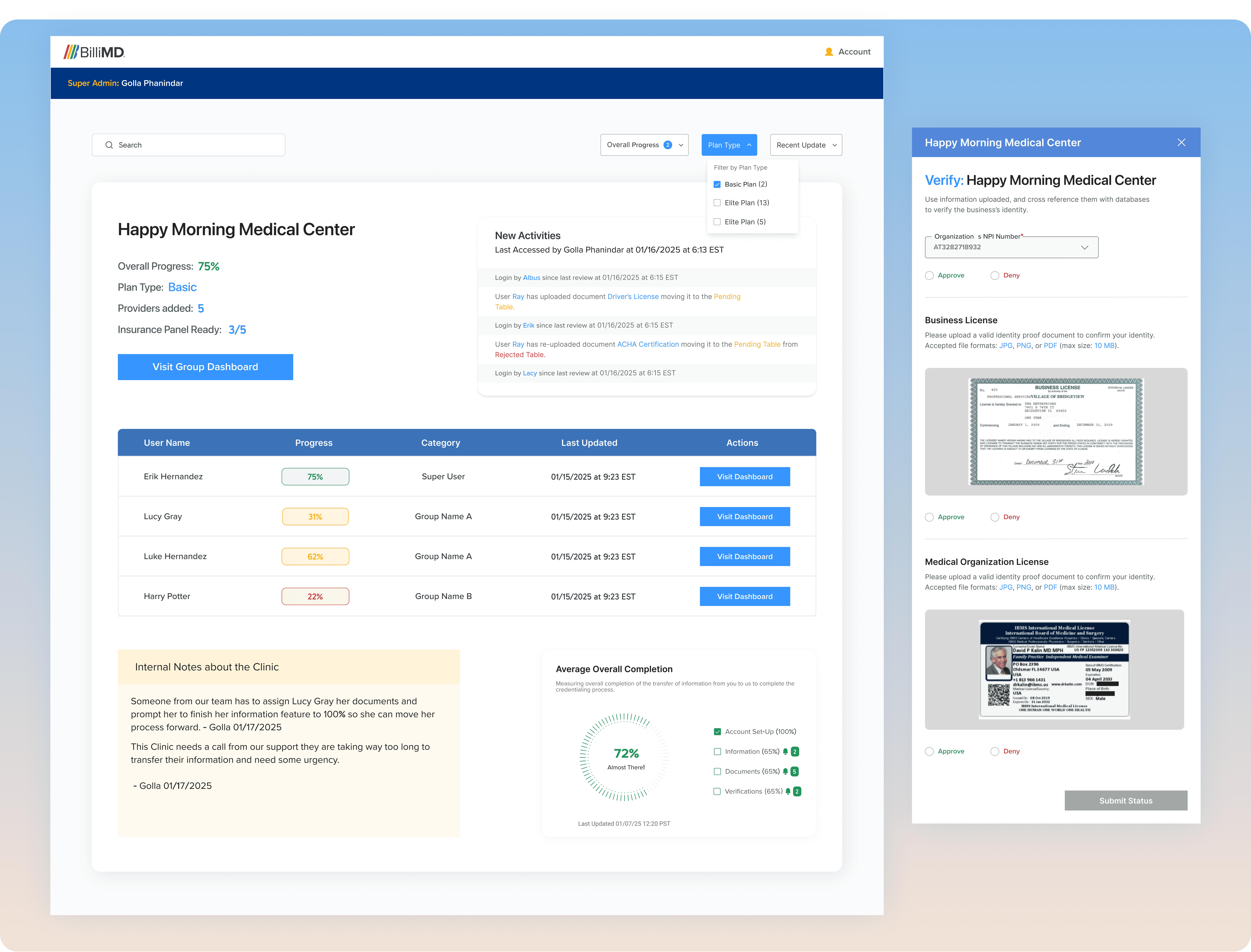 Purchases and manages the BilliMD plan. Controls user access, tracks enrollment statuses across all providers under their account, and interfaces with BilliMD's team.