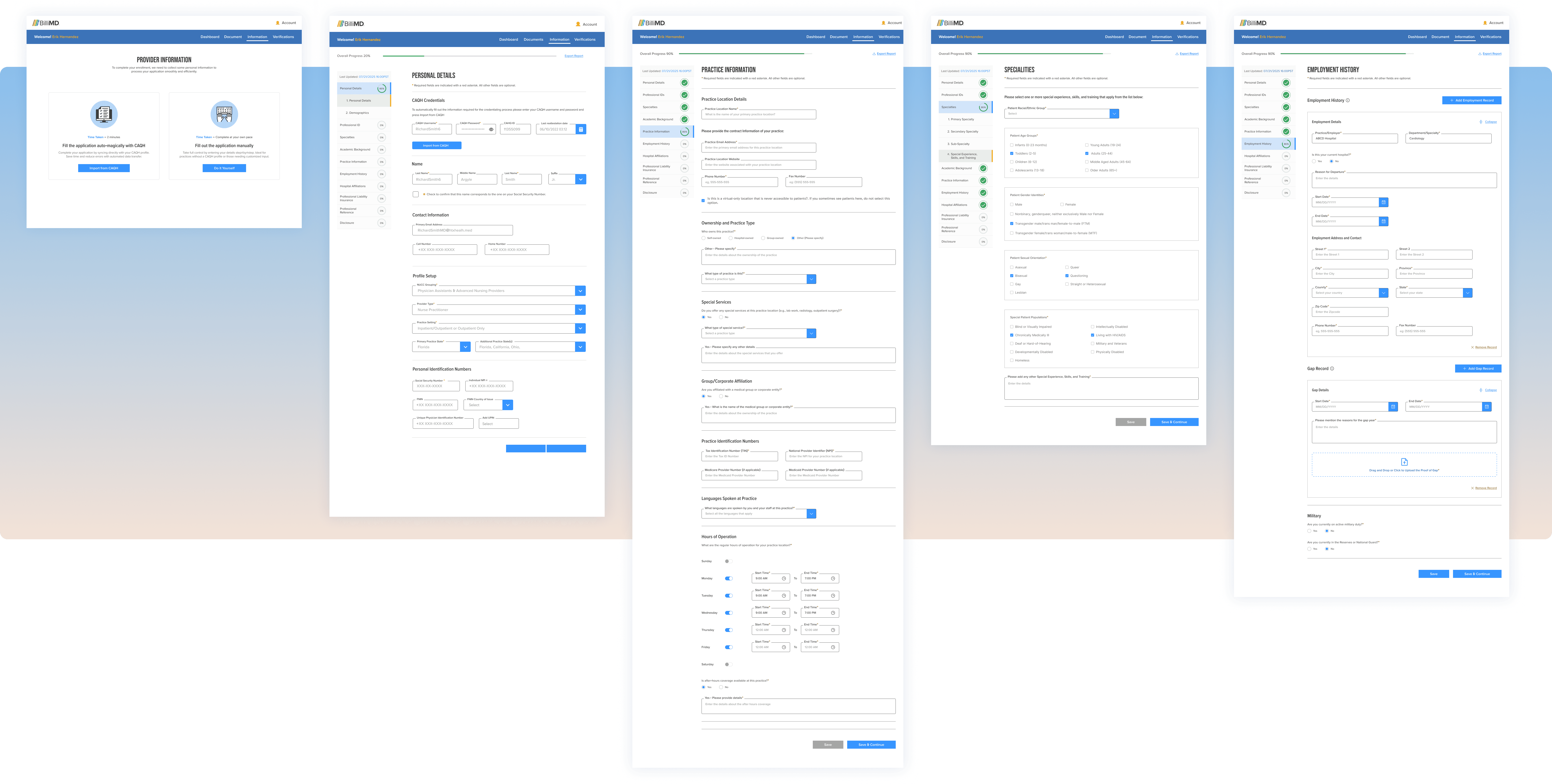 These sessions, combined with desk research into CAQH provider standards, healthcare UX conventions, and competitive analysis of MedTrainer and Modio Health, formed the foundation of every design decision. Every direction was pressure-tested before engineering picked it up.