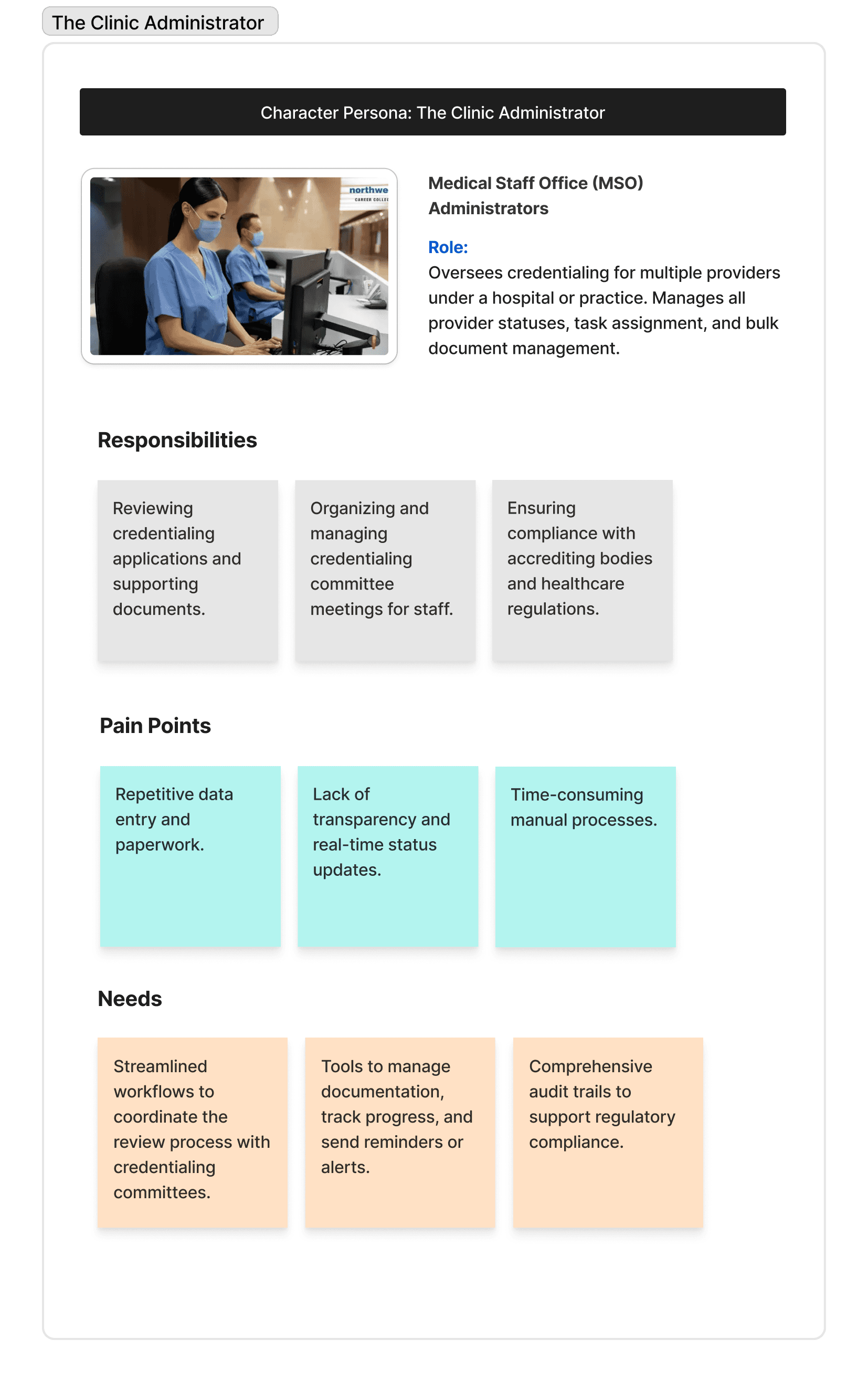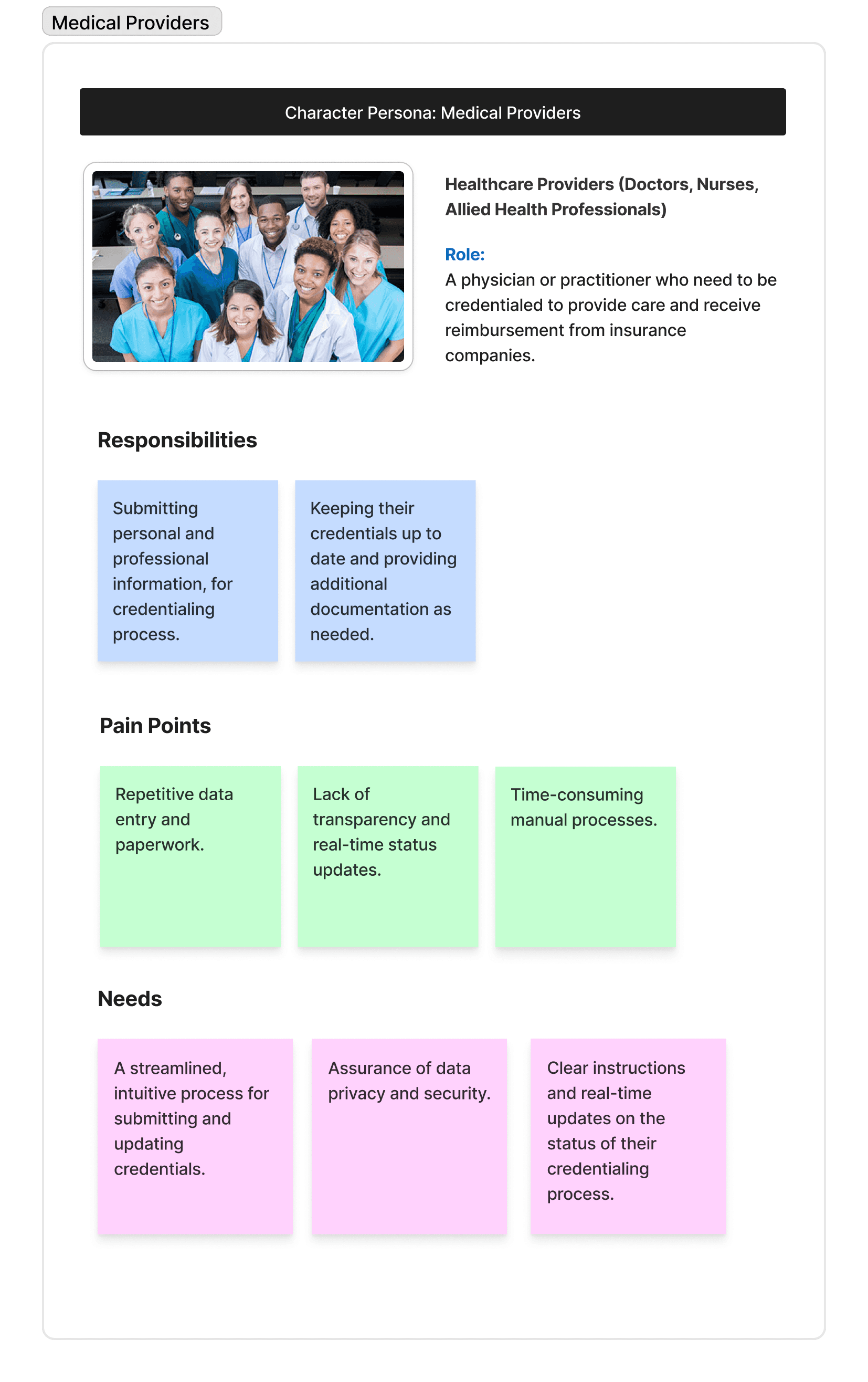 The product owner and our focused user group made it clear: the credentialing platform itself — the document management, tracking, and verification — was the real problem to solve first. Insurance selection would eventually be integrated there, not live as a standalone product.