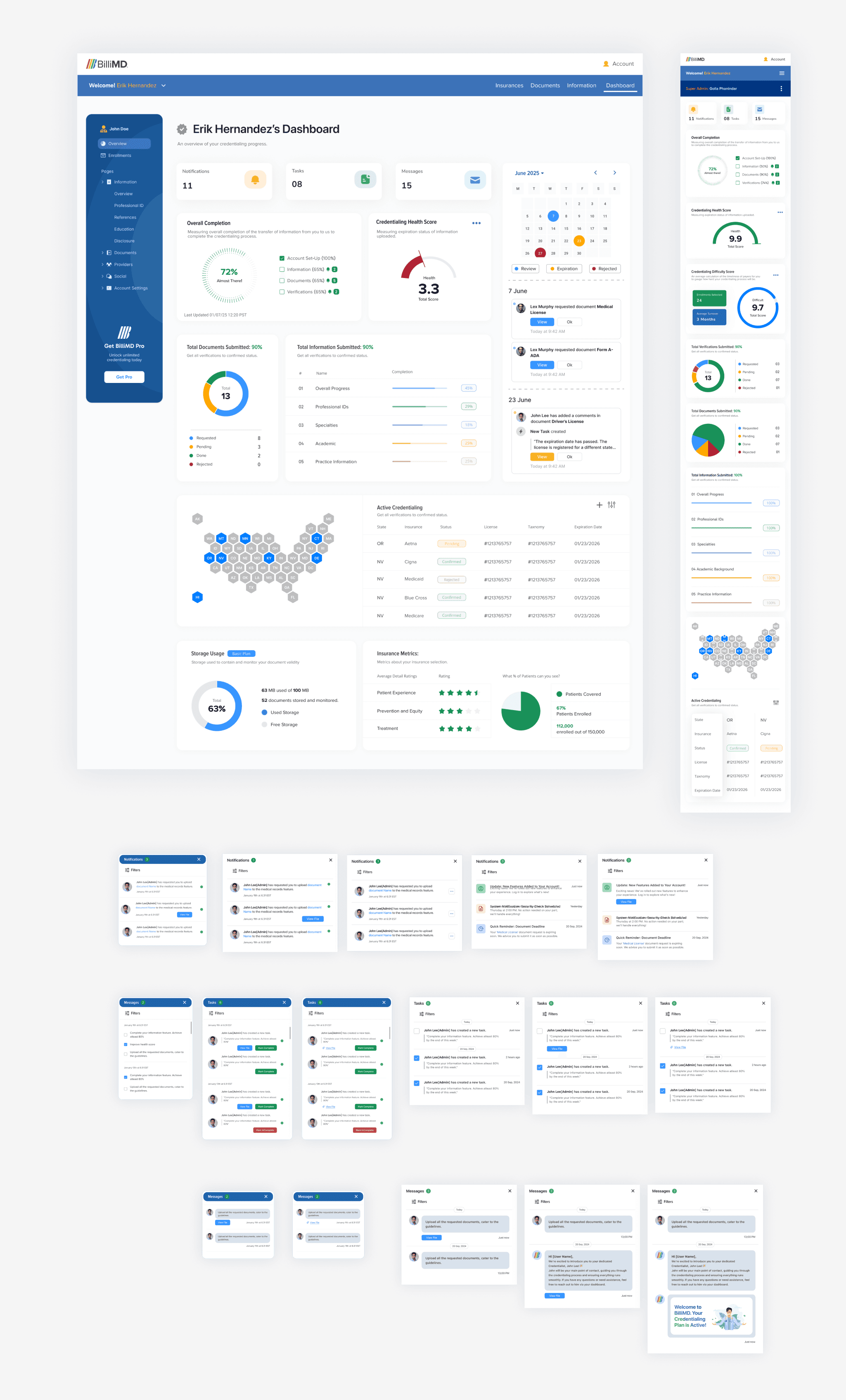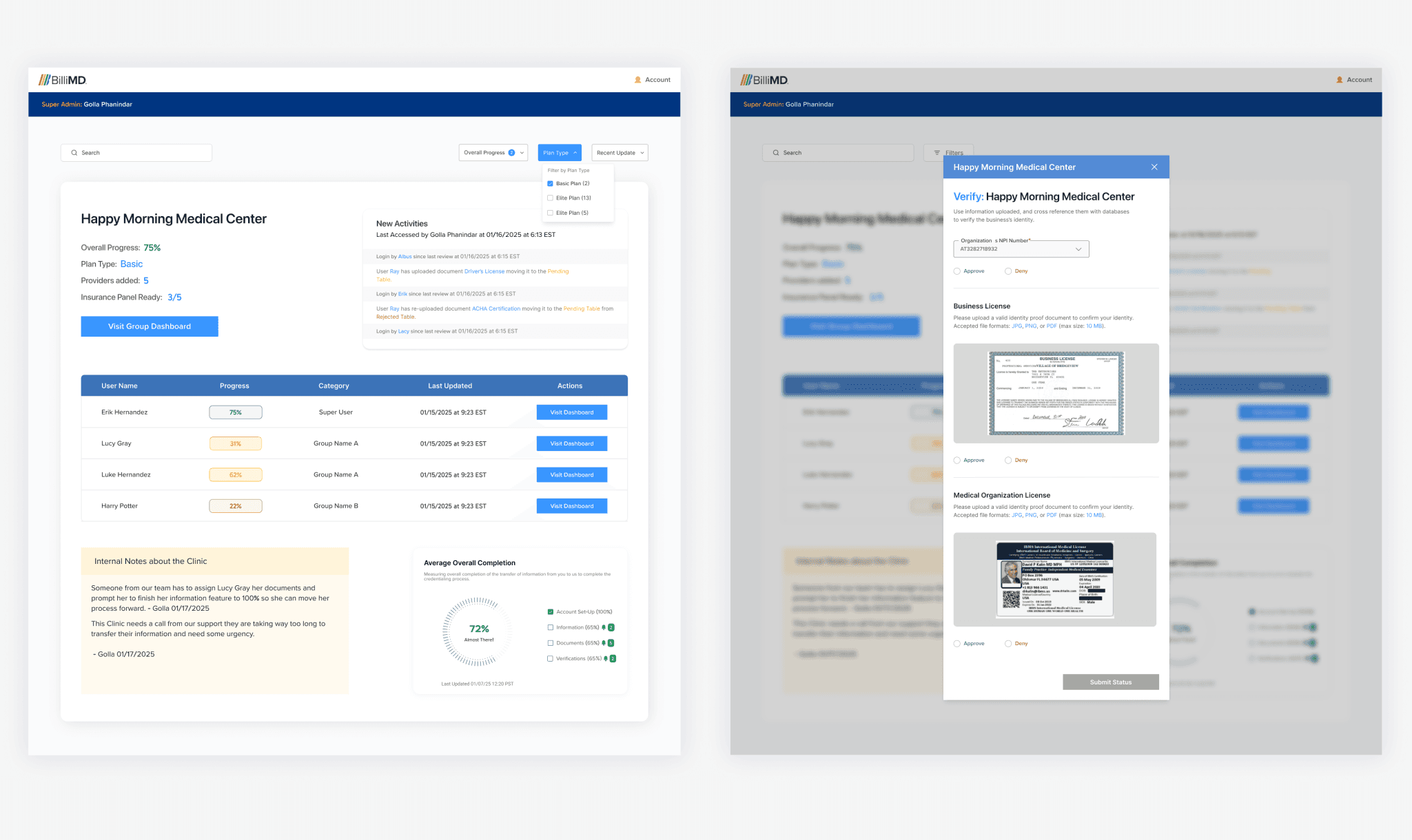 For BilliMD’s internal team, we created an Admin View to oversee credentialing progress across users, assign tasks, and manage verification seamlessly.